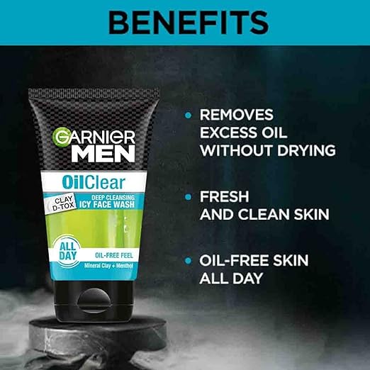 Deep clean your skin, unclog your pores, and enjoy an all day oil-free feel with the Garnier Men Oil Clear Clay D-Tox Deep Cleansing Icy Face Wash. The Garnier Men Oil Clear Face Wash purifies your skin, gently targets all skin impurities, and removes excess oil without drying out your skin. The mineral clay in the face wash for oily skin controls excess sebum production while keeping the skin’s natural oils and moisture levels intact. This intense anti-grease action ensures that your skin remains non-oily without feeling dry and uncomfortable all day. The menthol in the face wash instantly refreshes your complexion and gives you a cooling sensation that makes you feel fresh all day. Use the Garnier face wash for men to freshen up your complexion, get rid of dirt, oil, and sweat, and reveal bright and clean skin.