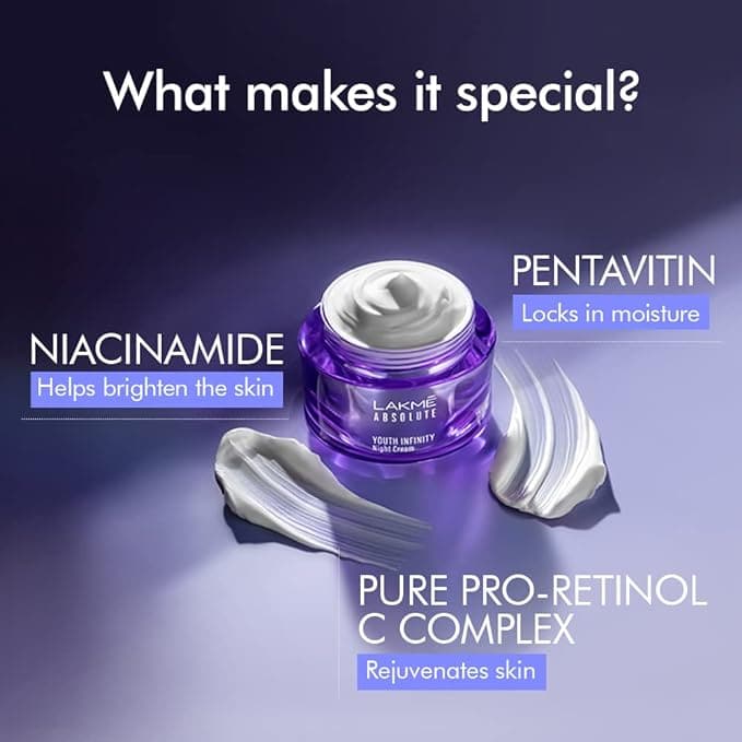 For a youthful glow on your skin with the Lakme Youth Infinity Night Cream. It helps lift|| firm and brighten skin over time with usage. This cream is enriched with Pro – retinol C complex that is known to delay signs of aging. It helps repair and regenerate your skin while you sleep|| so you wake up to even and brighter looking skin. (Consumer T2B 90% N=30) Regular use of the Lakme Youth Infinity Night Cream shows spectacular results– a youthful skin that helps reduces dullness and signs of aging. For the best results|| use the product every night. Dot across your face and neck. Gently massage in an upward and outward circular motion until it is absorbed. To get the best results|| use the complete Lakmé Absolute Youth Infinity range. Start with the Serum that helps lift|| firm and brighten skin. Follow it up with the Day Cream SPF 15 PA ++ with Pro-Retinol C Complex. Its sunscreens help protects the skin from harmful UV rays. Its sunscreens help protects the skin from harmful UV rays. At bedtime use the Night Crème that helps repair and regenerate your skin while you sleep|| so you wake up to younger and brighter looking skin. In the unlikely event of skin irritation|| stop using and consult a doctor immediately. Avoid contact with eyes. Wash your eyes thoroughly with clean water in case of contact. *OLD