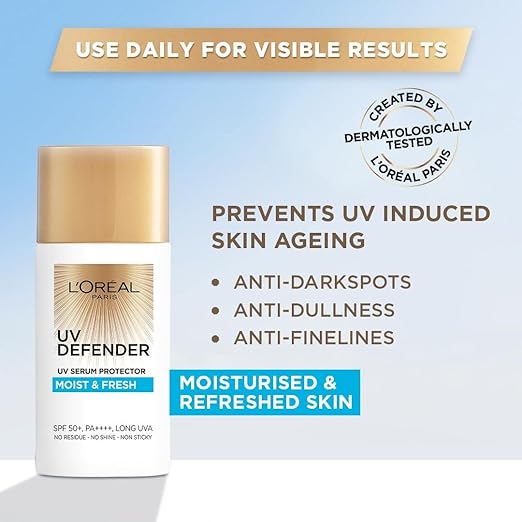 Did you know that daily UV exposure without daily sunscreen protection contributes up to 75%* of skin aging? The L’Oréal UV Defender Moist and Fresh is a sunblock cream that prevents 5 years of aging in only 6 months of use! This sun cream is a hydrating sunscreen that prevents fine lines, dark spots and dullness. The L’Oréal Paris sunscreen for the face is made of a non-greasy formula with NO RESIDUE, NO SHINE and is NON-STICKY to the skin. The UV Defender Serum Protector comes with a powerful combination of SPF 50+ PA++++ broad-spectrum protection against UVA, UVB and Long-Range UV. A creamy, non-oily texture with hydrating effect sunscreen formula, L’Oréal Paris UV Defender Moist & Fresh UV Serum Protector comes with moisturizing HYALURONIC ACID, a top dermatologist-recommended ingredient to plump skin with moisture. This sunscreen with hyaluronic acid is best suited for dry skin users who require hydration and nourishment. *Source: New insights in photoaging. UVA-induced damage and skin types. L’Oréal Research and Innovation. Experimental Dermatology 2014. Effect of the sun on visible clinical signs of aging. L’Oréal Paris Research. Clin Cosmet Investg Dermatol