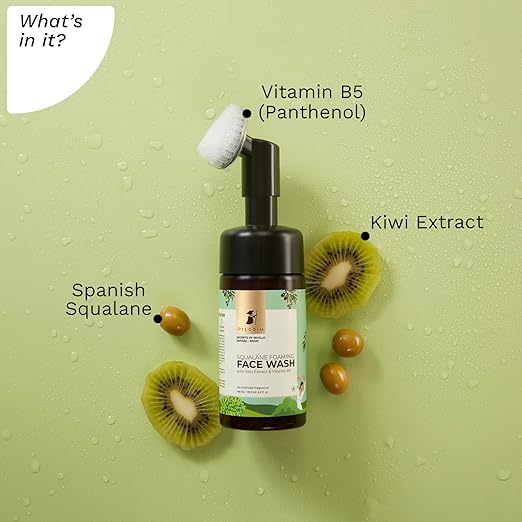 PILGRIM Spanish Squalane foaming face wash with Kiwi extracts & Aloe for skin hydration|Face wash with brush|Non drying cleanser for face | Face wash for dry & combination skin|For Men & Women | 120ml