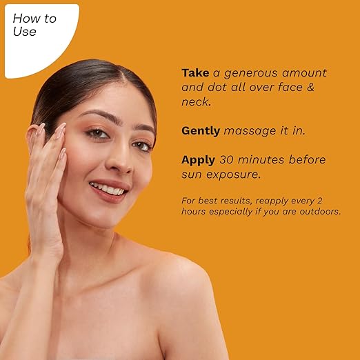 Take a generous amount and dot all over face & neck. Gently massage it in. Apply 30 minutes before sun exposure.