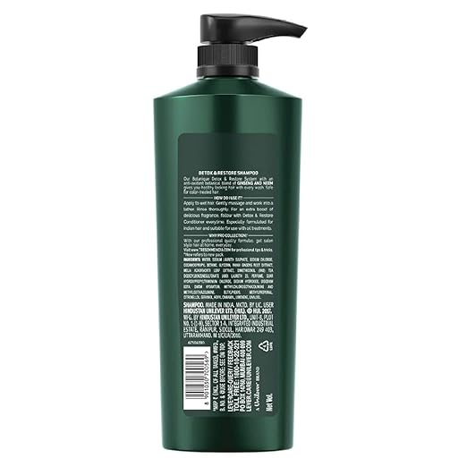 TRESemmé Botanique Detox & Restore Shampoo is a natural shampoo that contains an antioxidant botanical blend of ginseng and neem which helps nourish weak and damaged hair cuticles reviving your hair and restoring their manageability. Ginseng is known to give a healthy scalp and hair while neem is known for its antibacterial and antifungal properties which help tackle various hair problems. TRESemmé Botanique Detox & Restore Shampoo contains no parabens or dyes and gently purifies your hair of daily residue build-up. Our expertly crafted mild system gives you soft, shiny, salon-smooth hair. TRESemmé Botanique Detox & Restore Shampoo also provides frizz control for up to 24 hours. It is safe for color-treated hair and specially formulated for Indian hair. It is also suitable for use in conjunction with oil treatments. For best results, use with TRESemmé Botanique Detox & Restore Conditioner. This nourishing shampoo is exactly what you need for smooth, healthier hair. So, detox your way to stunning, healthy looking hair now with every wash and get salon quality hair without the salon price tag! Suitable for both men and women. To use: Apply the TRESemmé Botanique Detox & Restore Shampoo to wet hair, gently massage and work into a lather. Rinse thoroughly. For an extra boost of delicious fragrance, follow with TRESemmé Botanique Detox & Restore Conditioner.